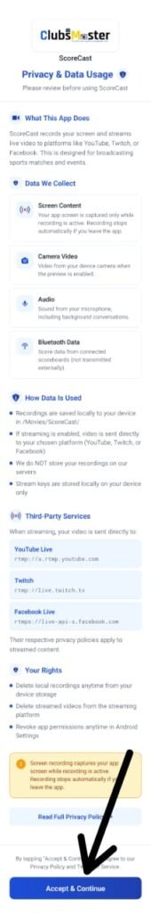When you launch ScoreCast for the first time, you will be prompted to review and accept the Privacy & Data Usage Policy.