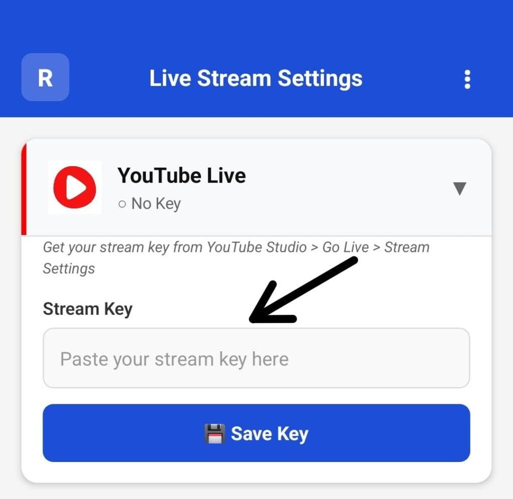 2. Enter the Stream Key generated from your YouTube Studio account