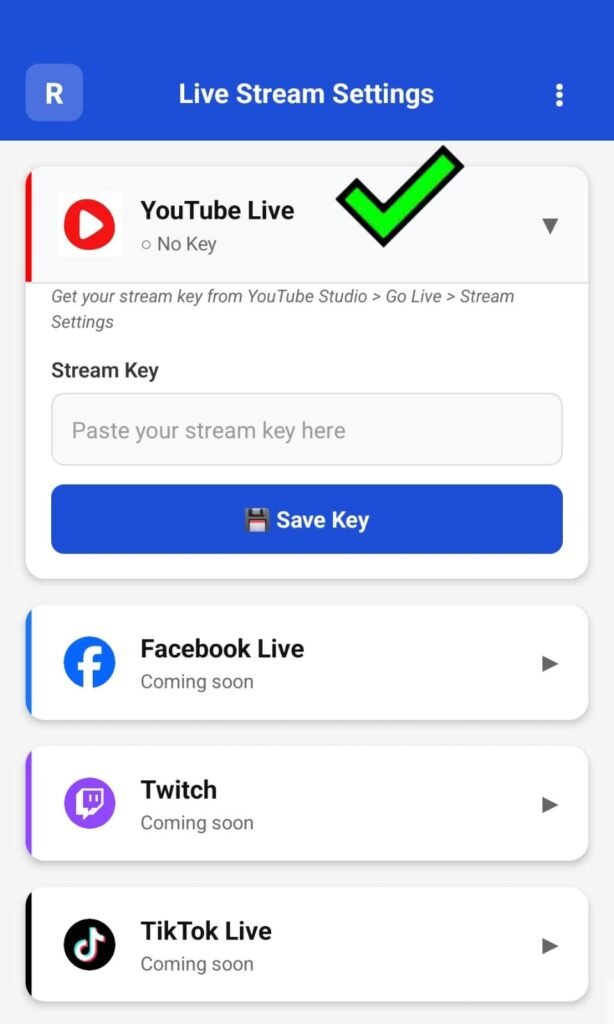 Stream keys are stored securely within the app for quick access during future sessions.
