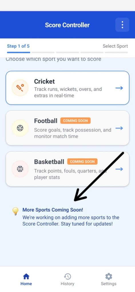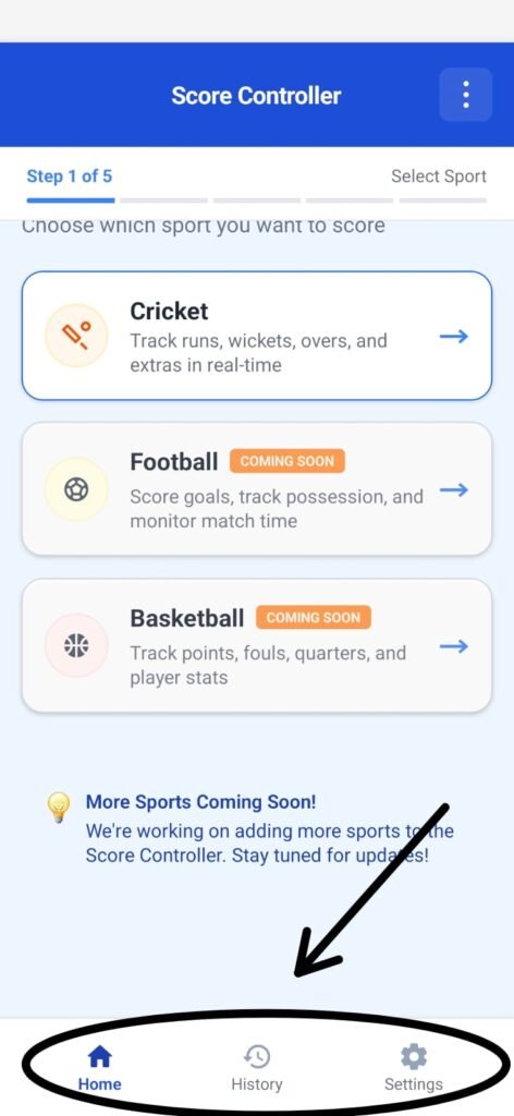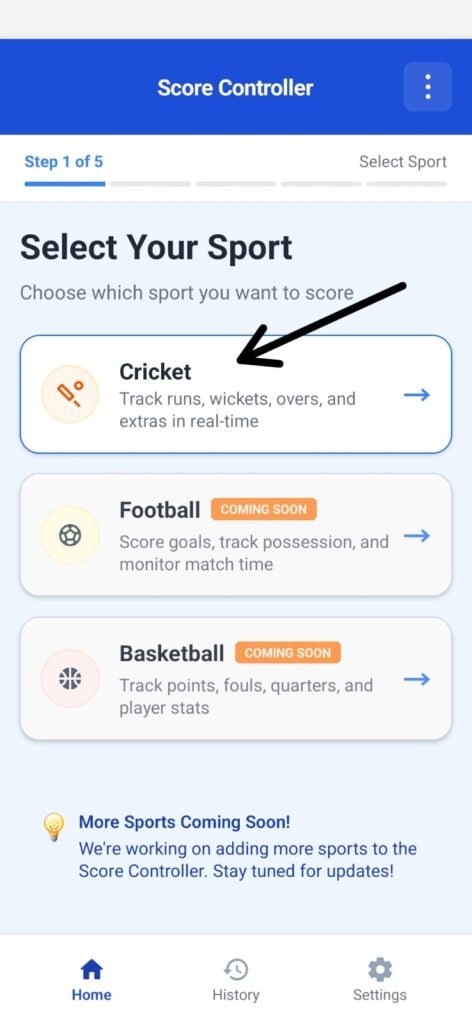 After selecting Cricket, users will continue to the cricket scoring setup process.